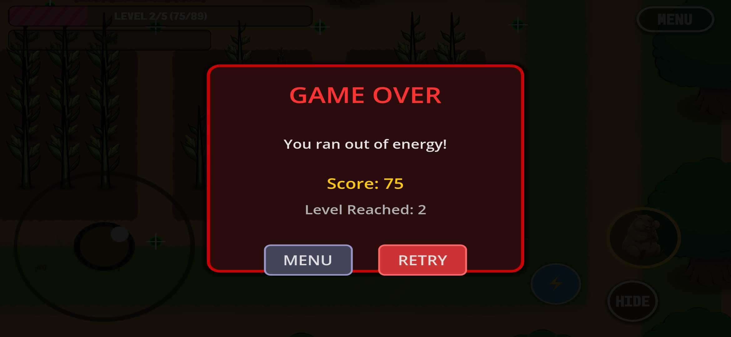 - **GAME OVER at 0%** energy!